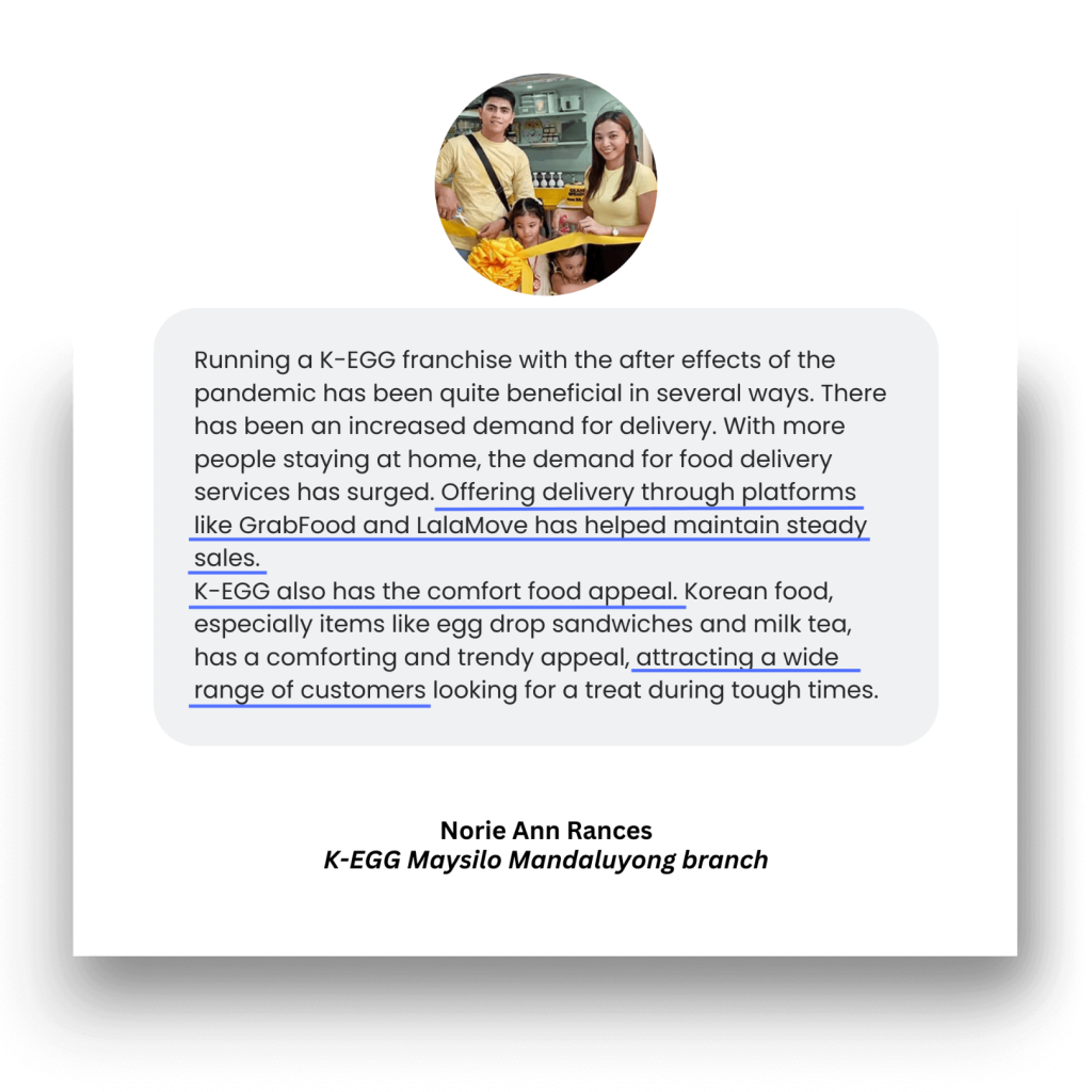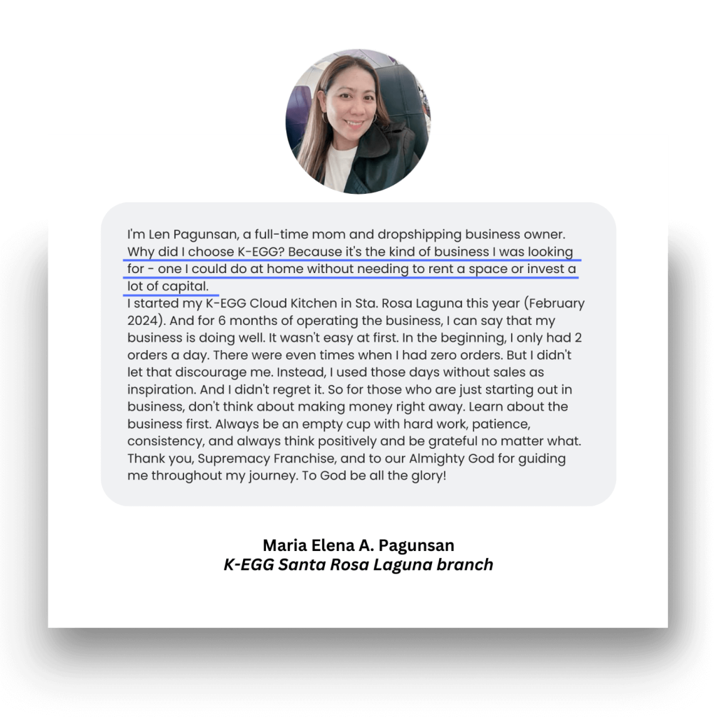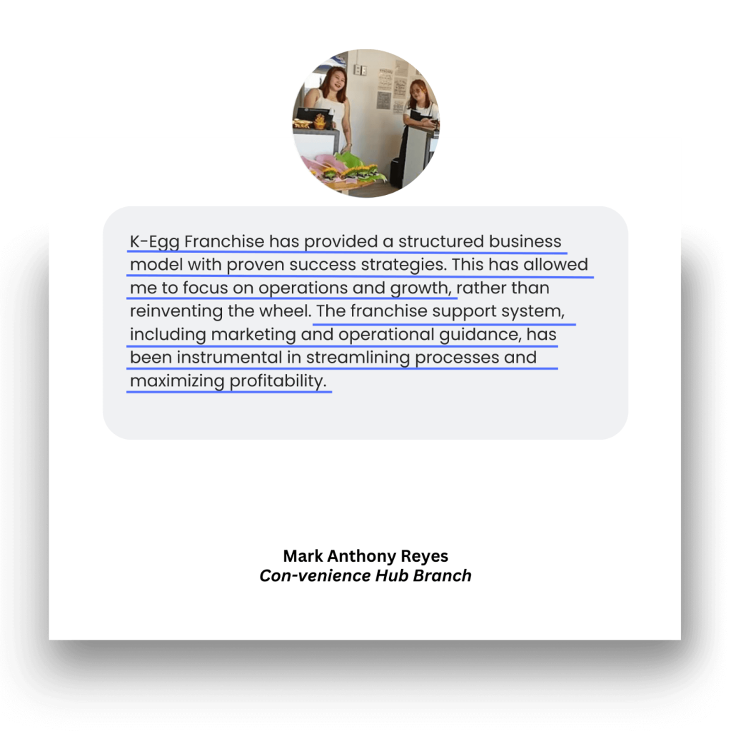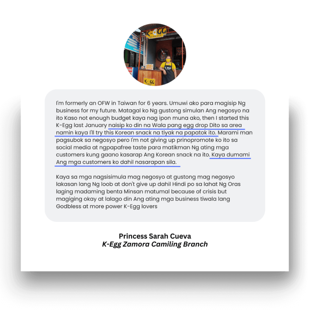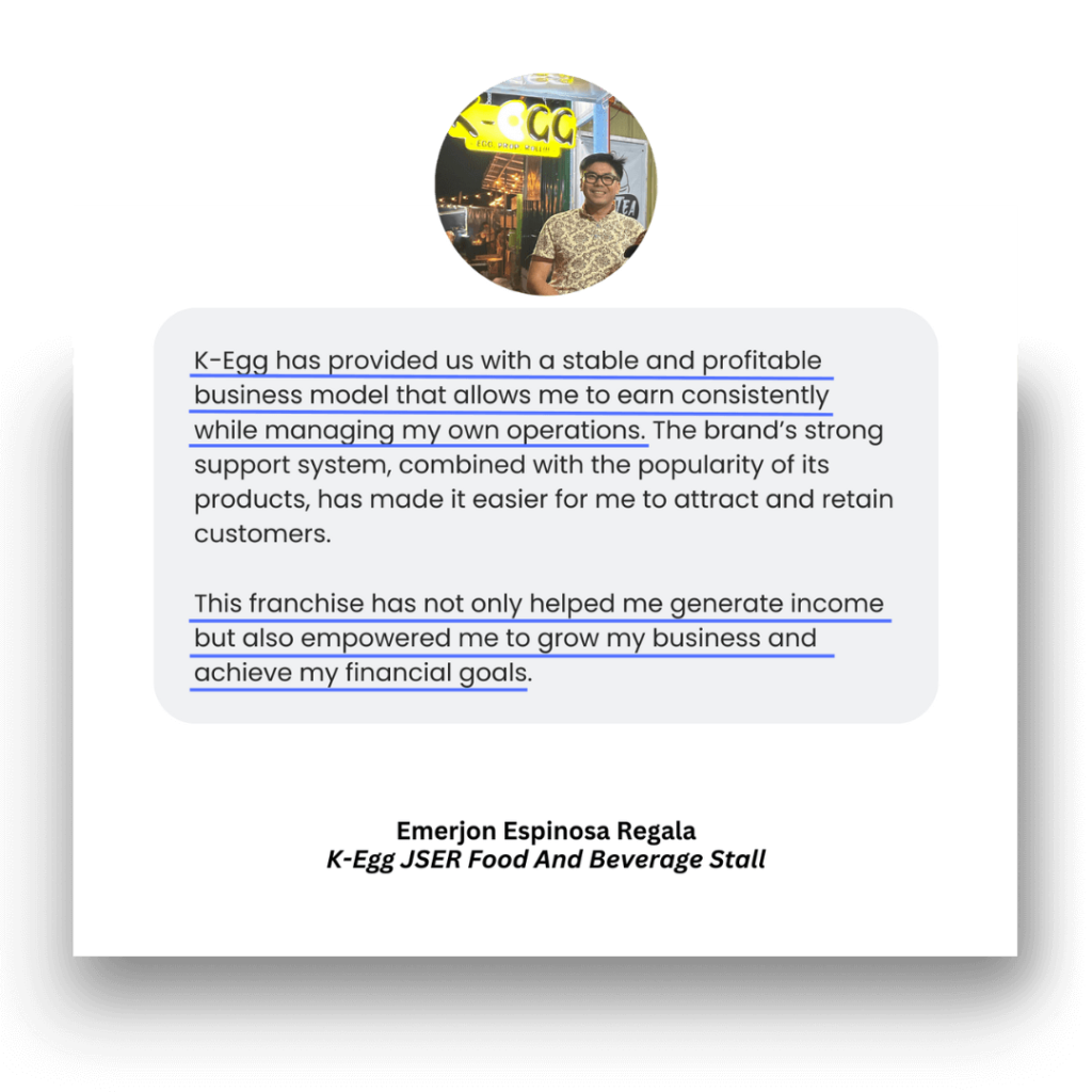 “Say no to second thoughts. Just do it! You don’t have to worry about the ROI for a small capital like K-Egg. ROI is just a month. Franchise now. Excellent business opportunity awaits you!”